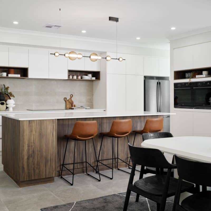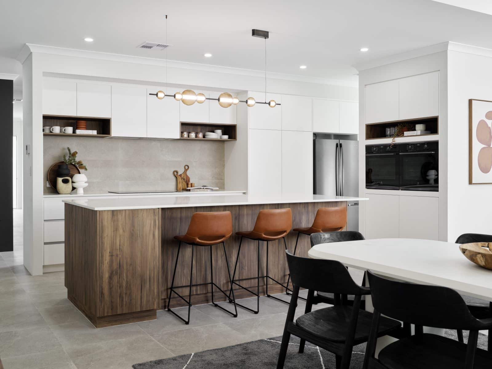 The Simmons bespoke WA made kitchen will impress with extensive cabinetry and high, recessed feature ceilings.