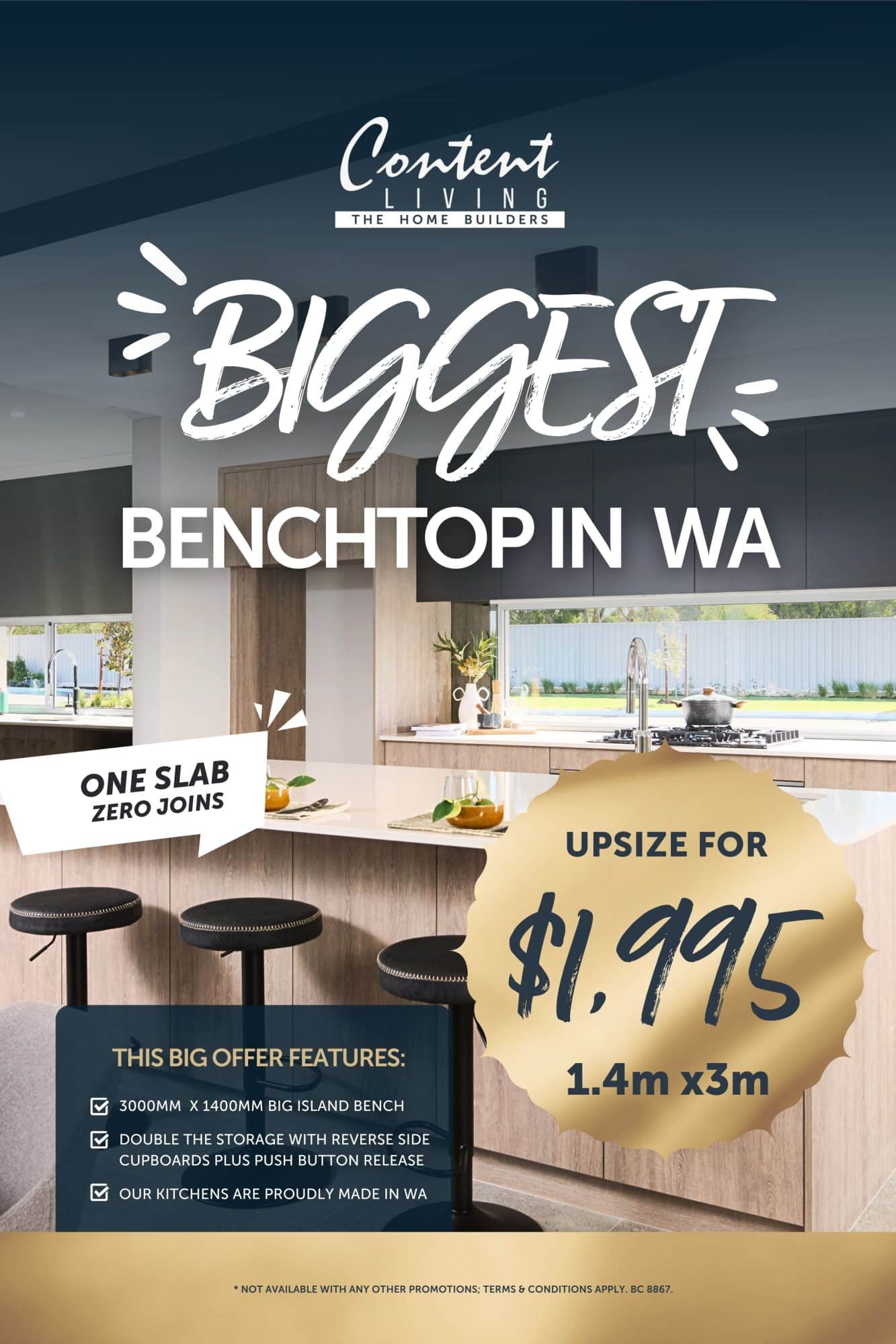 CONTENT LIVING brings you the largest island benchtop available with a new Perth home*