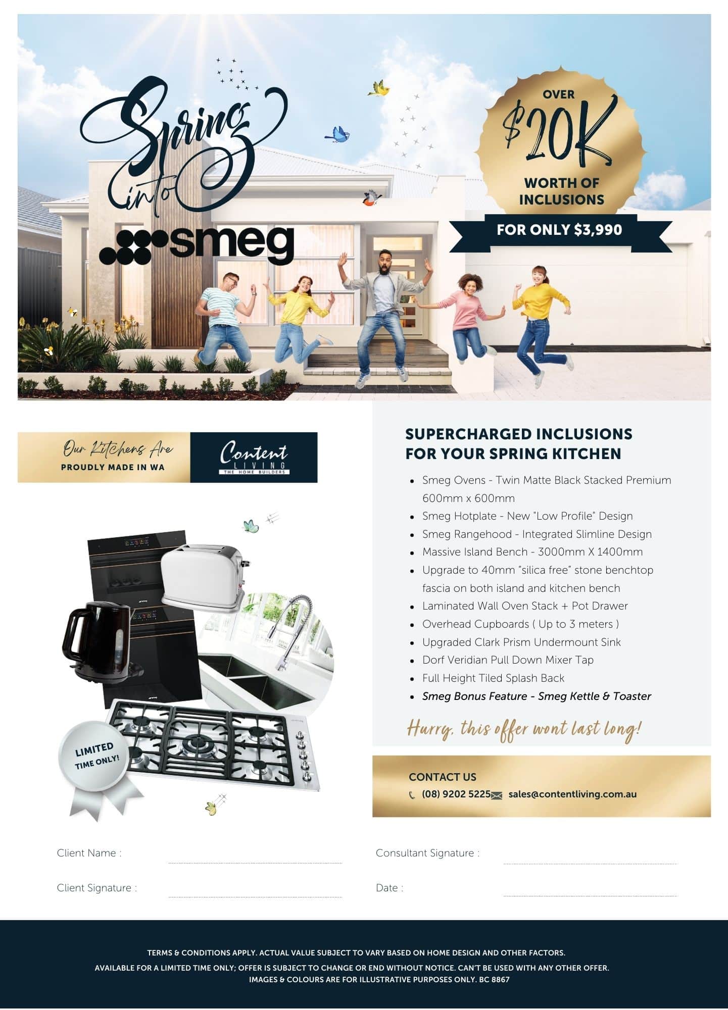 CONTENT LIVING loves a great kitchen! (we all do right?) We are pleased to offer the new “Spring into Smeg” promotion featuring SUPERCHARGED INCLUSIONS FOR YOUR KITCHEN to really take your new Content Living home to the next level, all for $7,990* – Hurry, Limited Time Only!