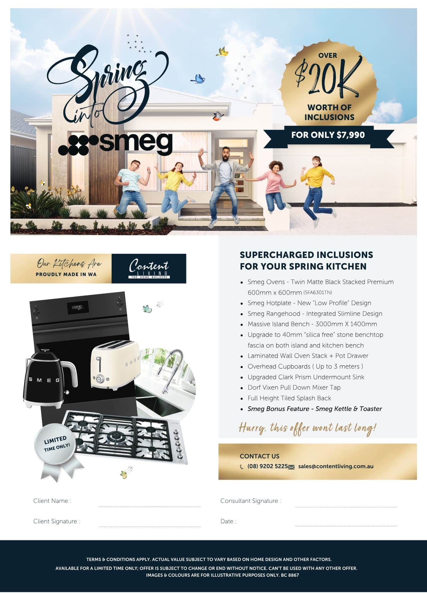 CONTENT LIVING loves a great kitchen! (we all do right?) We are pleased to offer the new “Spring into Smeg” promotion featuring SUPERCHARGED INCLUSIONS FOR YOUR KITCHEN to really take your new Content Living home to the next level, all for $7,990* – Hurry, Limited Time Only!